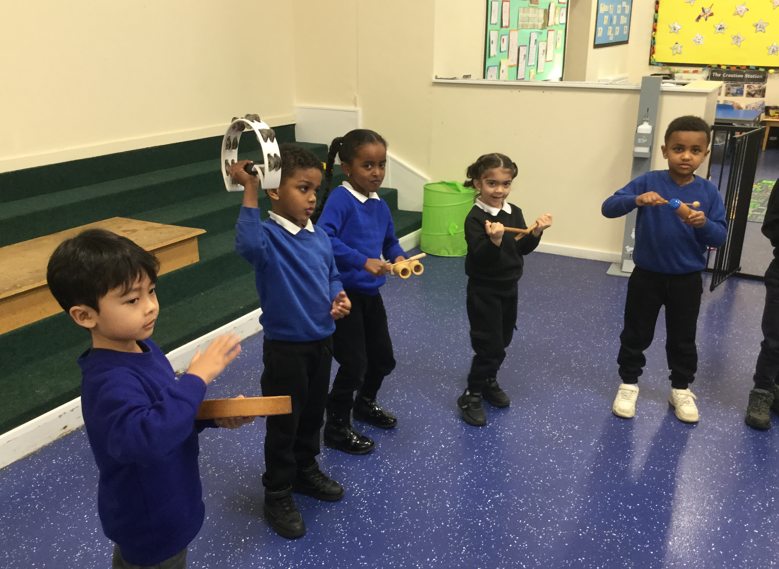 In Year 1, children are taught to play a range of percussion instruments. During these lessons, listening skills are developed as children learn how to play and stop at the correct time. They also learn about resting position, ready position and playing position. Year 1 also explore a range of music genres and explore the music they are listening to with movement.