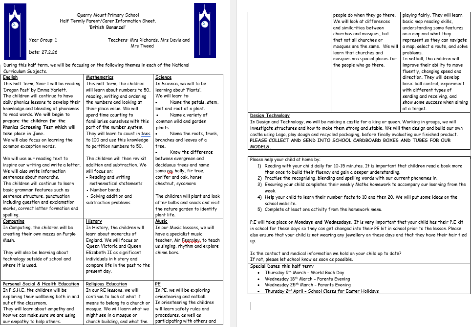 Teachers: Mrs Richards (Monday - Wednesday)/Mrs Davis (Wednesday -Friday)