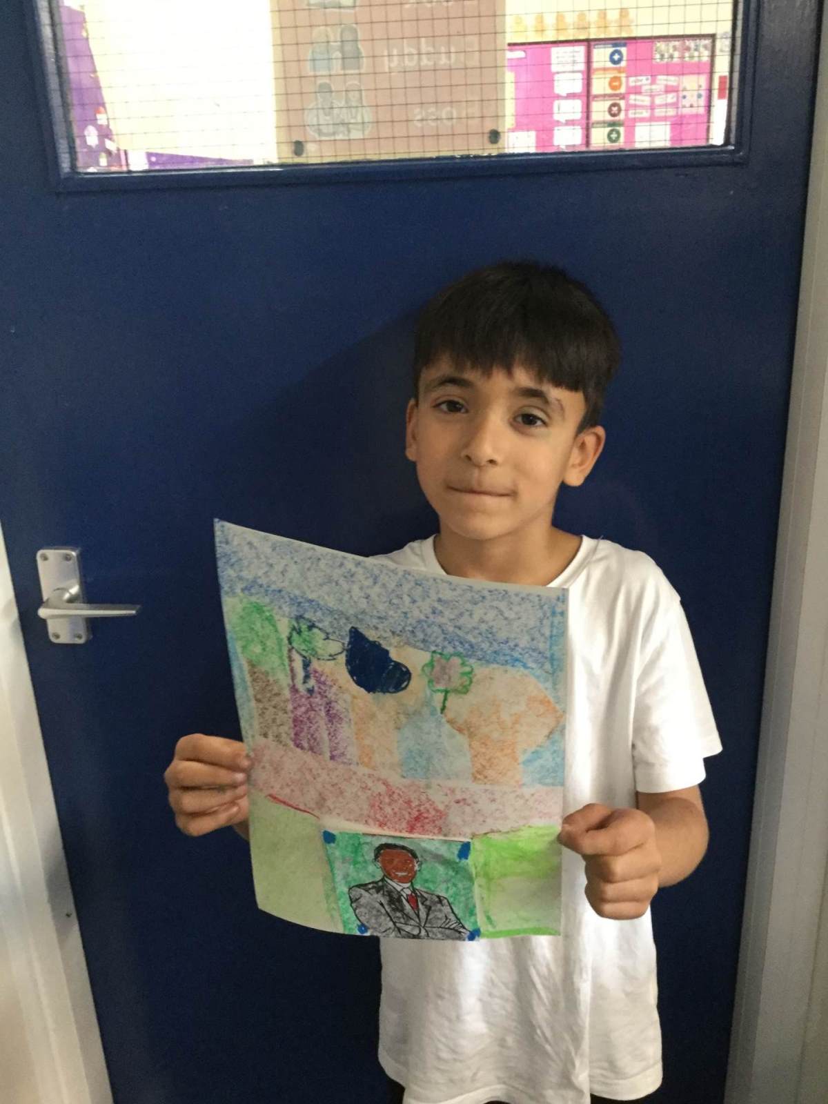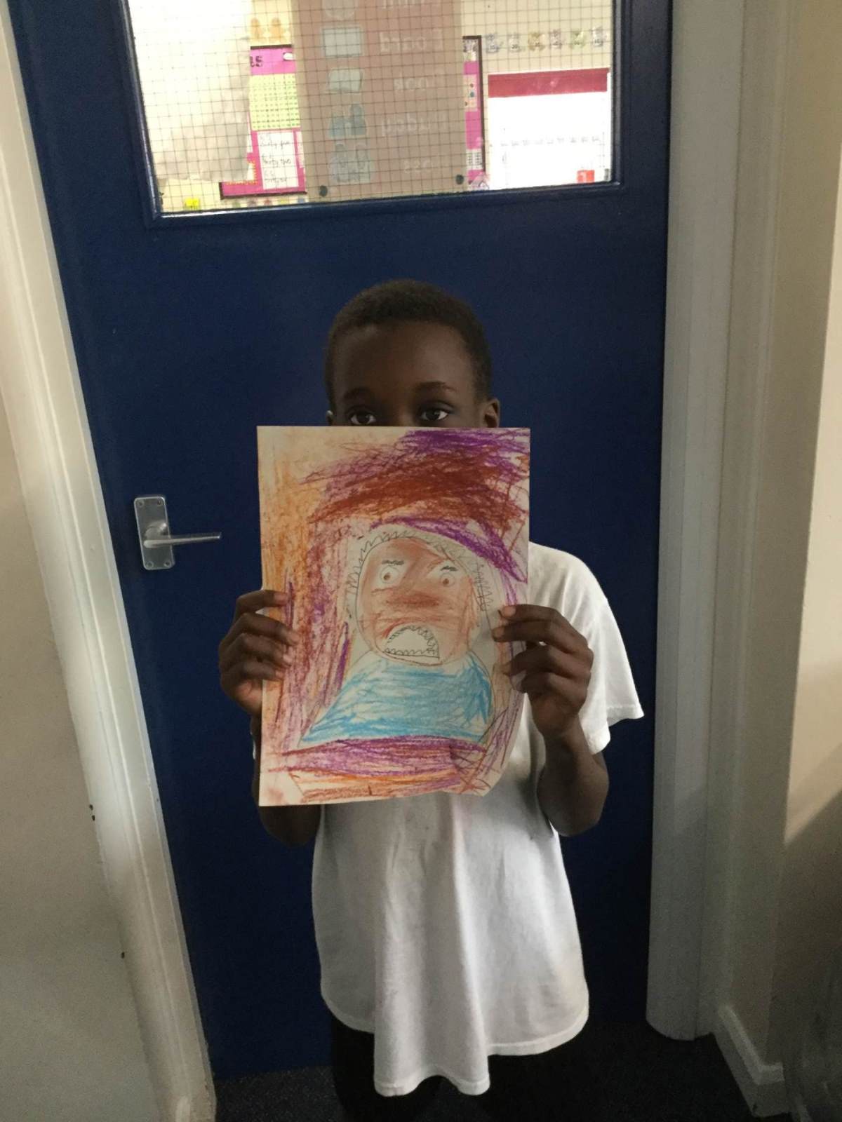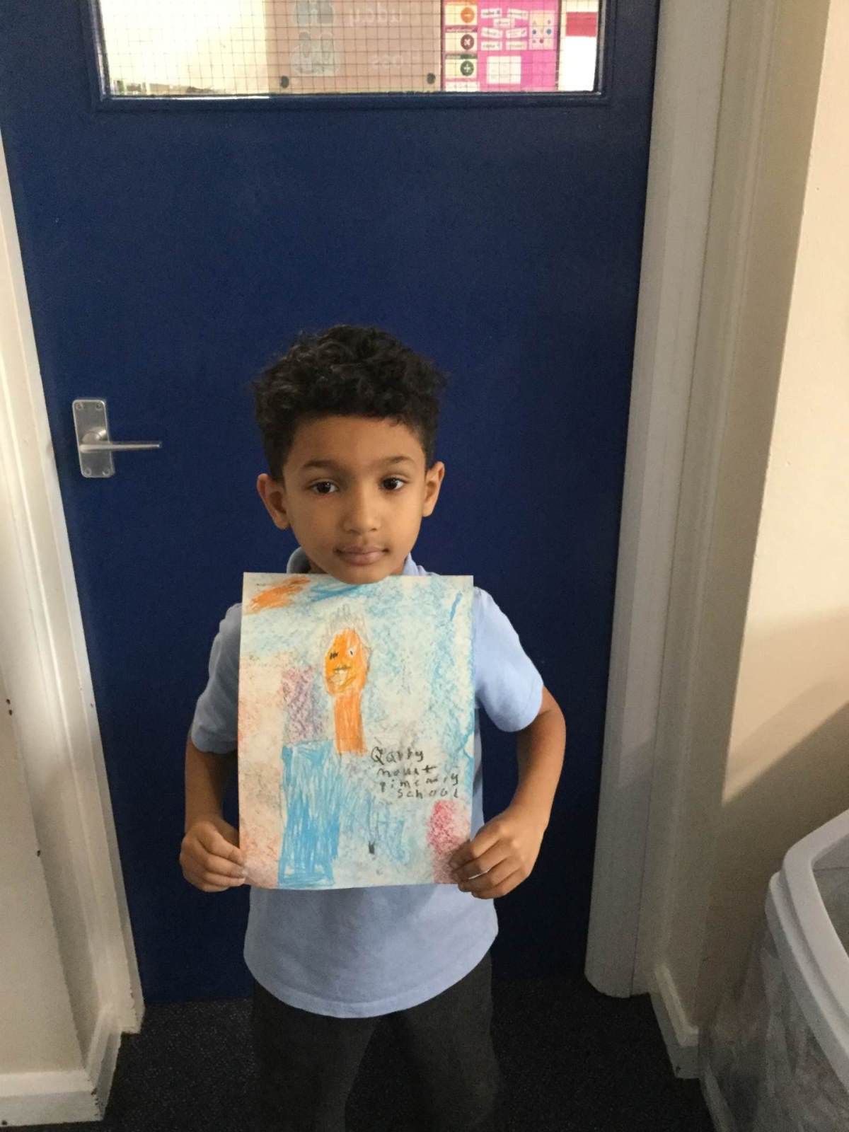 In Art, children created a self portrait of themselves in the style of American artist Kehinde Wiley.
